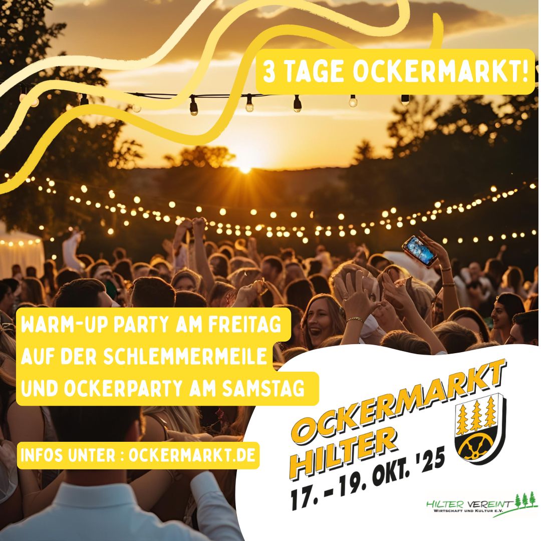 Wie auch im vergangenen Jahr wird der Ockermarkt in diesem Jahr mit der Warm-Up-Party am Freitagabend (17. Oktober 2025) beginnen. Auf der Sparkassen-Bühne in der Gravestraße wird ab 19:00 Uhr die Band „Next One“ mit uns in den Ockermarkt hineinstarten. Auch die Gastronomiestände entlang der Schlemmermeile werden öffnen.